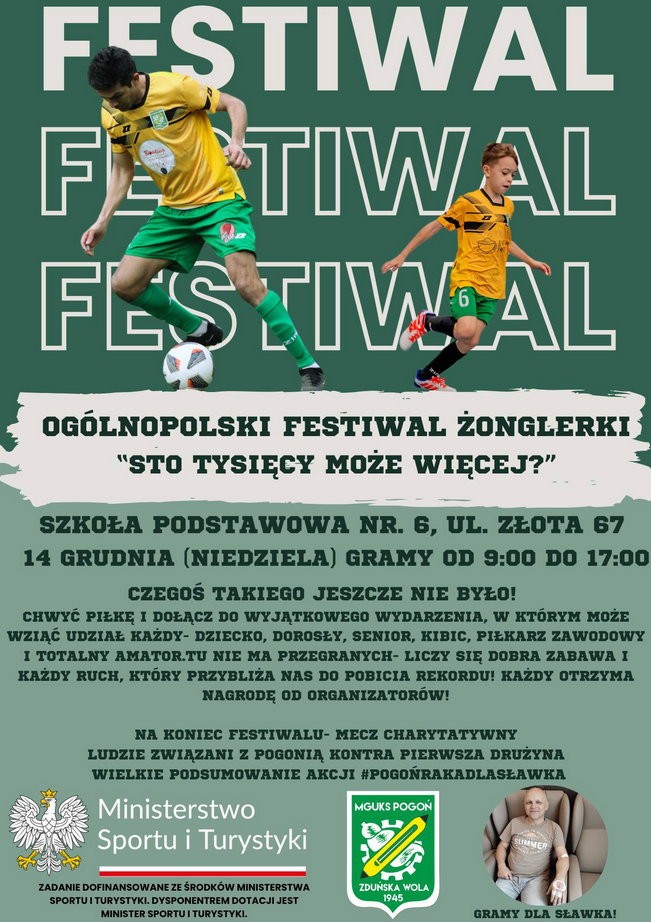 Ogólnopolski Festiwal Żonglerki pod hasłem Sto tysięcy, może więcej? odbędzie się w niedzielę (14 grudnia) w hali sportowej w Zduńskiej Woli przy ulicy Złotej. To ten sam obiekt, w którym po najważniejsze trofea w futsalu sięgała Gatta. Tym razem będzie można uczestniczyć w wyjątkowym wydarzeniu, które zwieńczy charytatywny mecz dla walczącego z nowotworem dziennikarza Sławomira Cybulskiego.